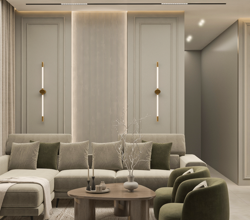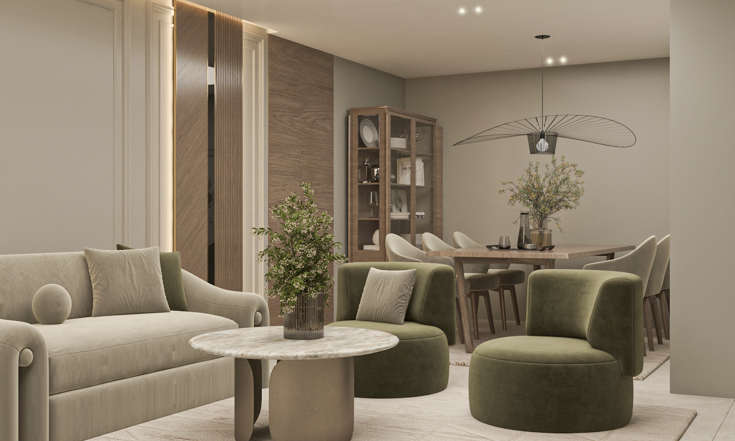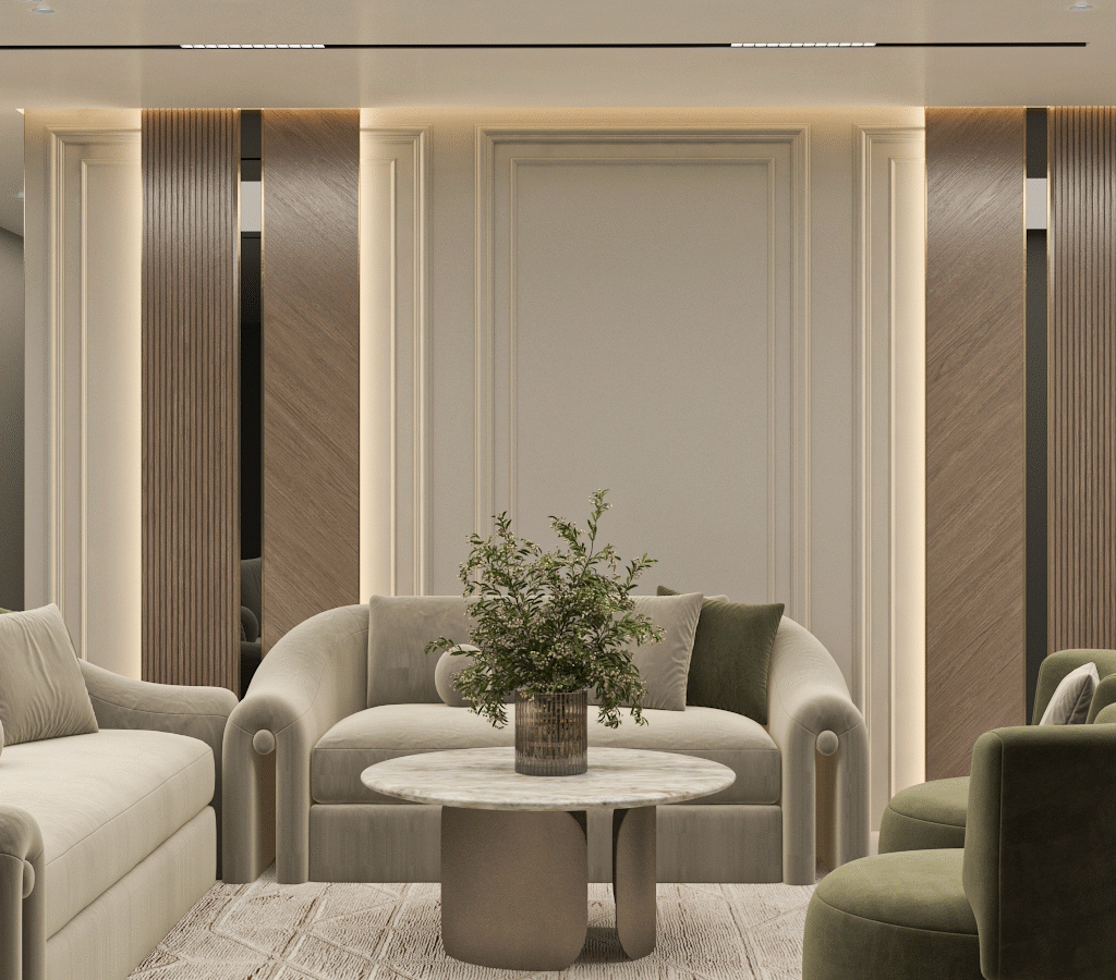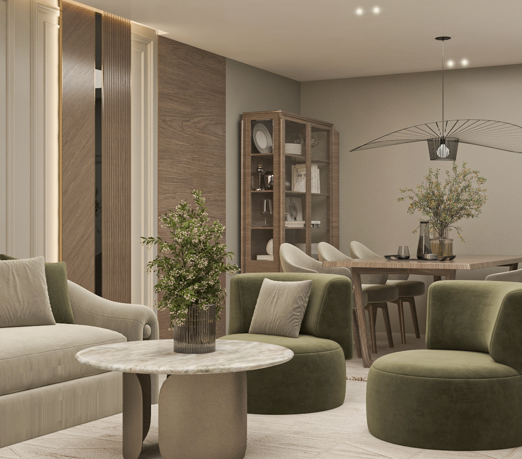 An open-plan reception area that merges curved forms with olive and beige tones, layered lighting, and subtle gold accents. The layout includes multiple seating zones and a modern dining space, all designed to foster flow and harmony. The material palette emphasizes balance and comfort in a timeless, welcoming setting.