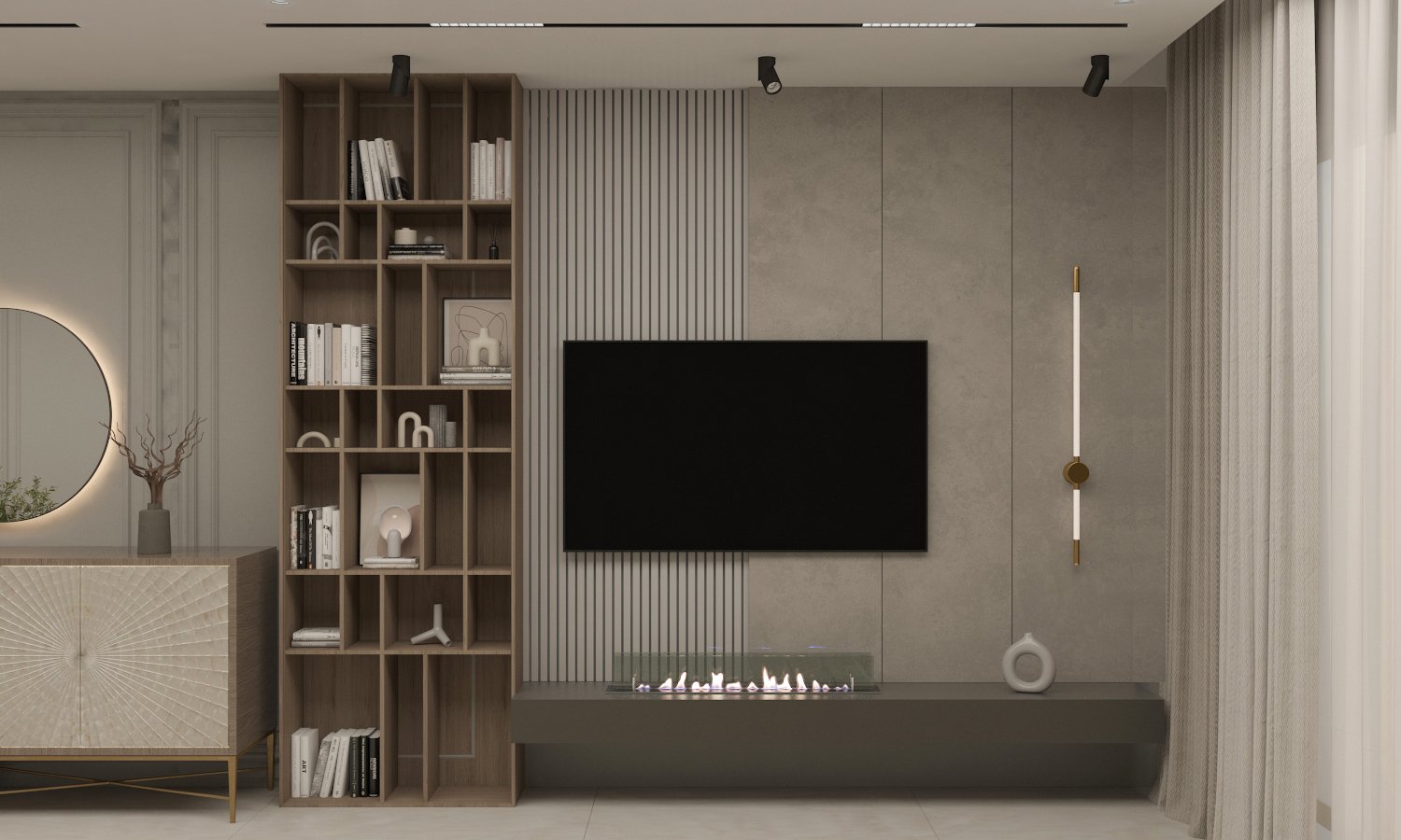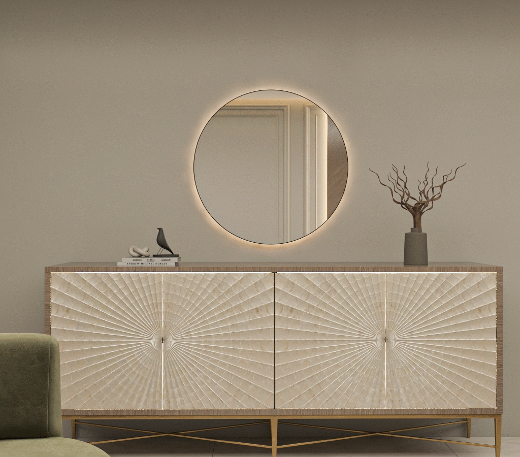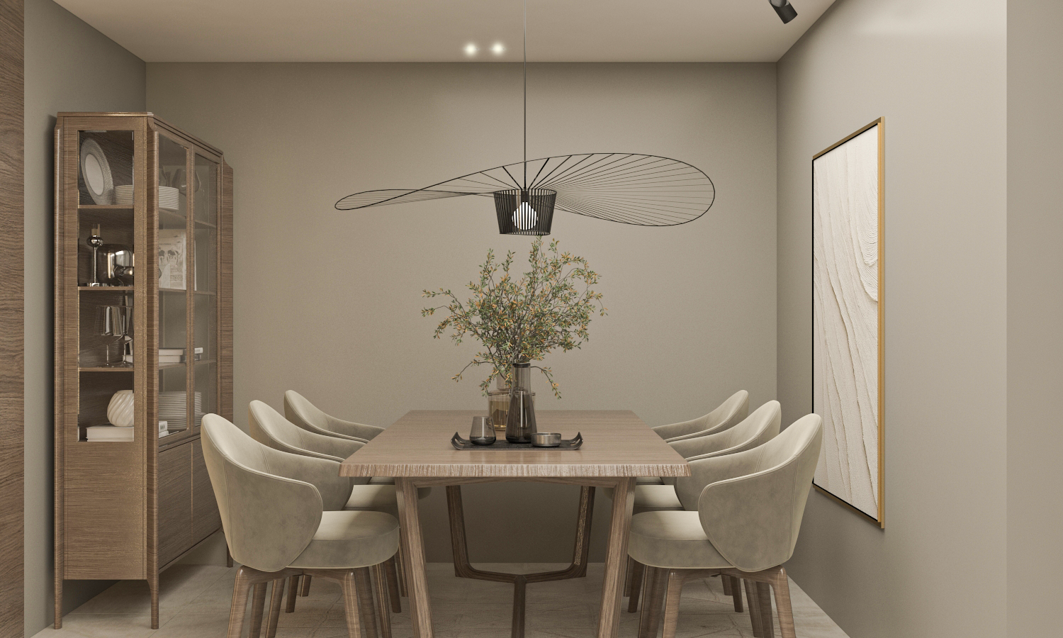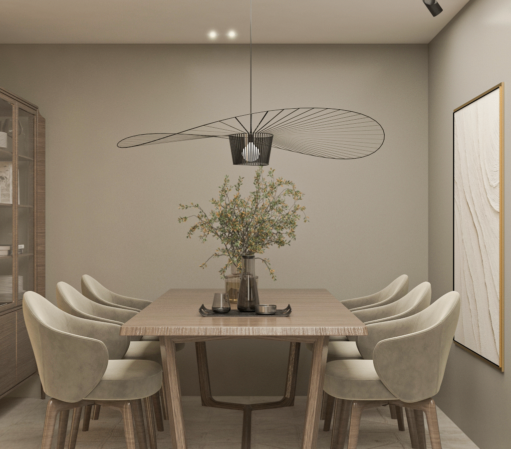 An open-plan reception area that merges curved forms with olive and beige tones, layered lighting, and subtle gold accents. The layout includes multiple seating zones and a modern dining space, all designed to foster flow and harmony. The material palette emphasizes balance and comfort in a timeless, welcoming setting.